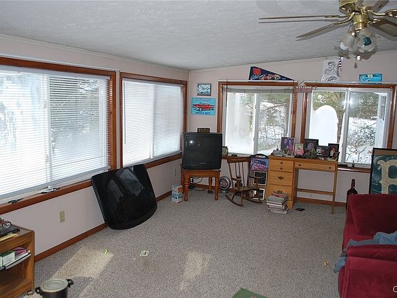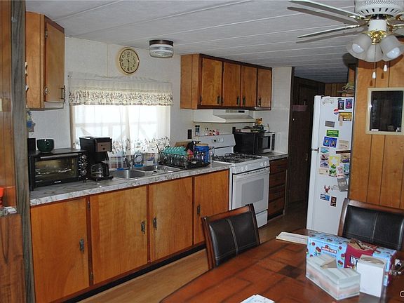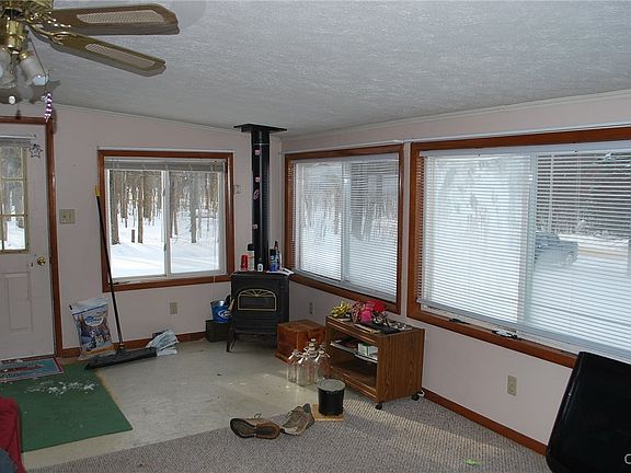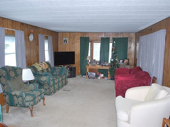 Two to three bedroom mobile home with additions located on a ¾ acre Village edge lot- this home features a large three season sun porch with propane gas stove and plenty of windows – this leads to the open floor plan of the kitchen/dining/living room – the back living room addition is currently being used as a large master bedroom which also has propane stove and sliding patio doors which lead to nice wooded back yard and deck – adjacent to the living room/bedroom addition is two smaller bedrooms and a full bath- also included is a two car detached garage with room for cars and lawn equipment-the original mobile home foot print has a full basement with newer furnace, central air and the water heater.