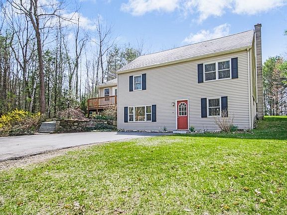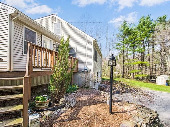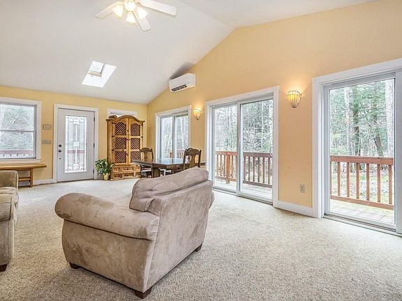 Hidden Gem yet very easy highway access! Enjoy the tranquil setting for this charmer of a 3 BR 2 BA Cape on over 2 Acres! Starting with the private drive to the wrap around deck into the striking, bright cathedral Great Room with fireplace, skylights and AC, this property is a must see! From the Great Room, enter through double french doors to the Dining Room and the Kitchen with hickory cabinets, both with birch hardwood flooring, to the comfy Living Room with bamboo flooring. Also there is a first floor Bedroom with new carpeting and a first floor full Bath with conveniently located laundry. The second floor has two very good sized Bedrooms and a newly renovated full tiled Bath. The heated walk-out lower living area is finished to include a bonus room and lots of additional usable space. Oversized sun deck and hot tub overlook the large back yard edged by woods. Enjoy!