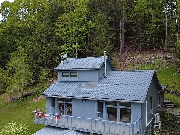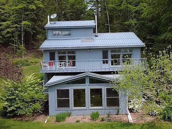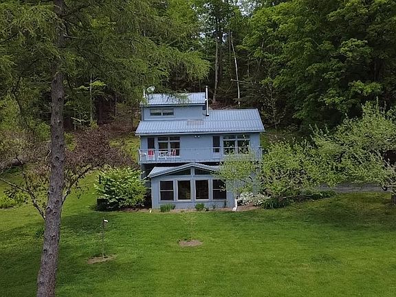 Gardeners delight in this South facing, peaceful, wildlife sanctuary. Private setting overlooking orchards of fruit trees and copious berry bushes. Contemporary home with hardwood floors and sunlight with many walls of glass for passive solar. An energy efficient house with a variety of heating options. Main floor has an open concept Kitchen/dining area. Large living rm with wood stove and connected 34x7 ft. composite deck. Two bedrooms with double closets and a new tiled bath w/linen closet. Top floor has a treetop bedroom. The lower level has an improved 19x15 studio. The house has 5 minisplits and a new metal roof . There was a two stall barn now used for chickens. Goshen stone patio as well as several stone walls. It is close to Conway Pond and Ashfield Lake. 20 minutes to Shelburne Falls and Deerfield. 30 minutes to Northampton and Greenfield. Be part of the thriving Community of Conway with its welcoming neighbors and excellent Public school. Come home and listen to the birds.