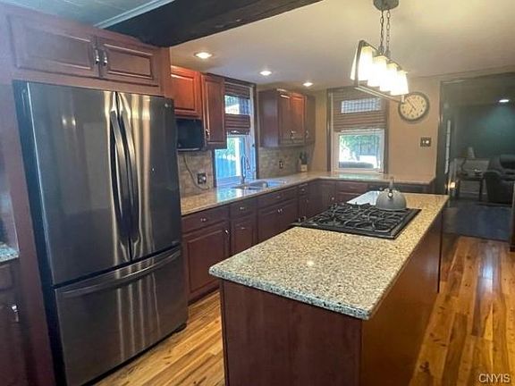 Truly spectacular is the only way to describe this completely remodeled 3 bedroom, 2 bath village home. Located in one of the most sought after neighborhoods in Ilion this home will make you feel you are on vacation every day. How do I begin to describe how amazing this home is from the gorgeous kitchen with granite counters, stainless appliances and cherry cabinetry to the warm and inviting family room that was added onto to create a larger space that walks out onto a covered deck that makes you feel like you just checked into an island resort! Sit down around your fire pit and enjoy your in ground pool and when you need a refill head to your garage bar and belly up to the bar for a refill. The upstairs bath has a newly added custom walk-in stone shower with dual shower heads and a spa jet tub and fireplace with your choice of flame color depending on your mood. This home has been lovingly and carefully enhanced by the current owners who hope that the new ones will love it and enjoy it as much as they have. This one really says "Welcome home!"