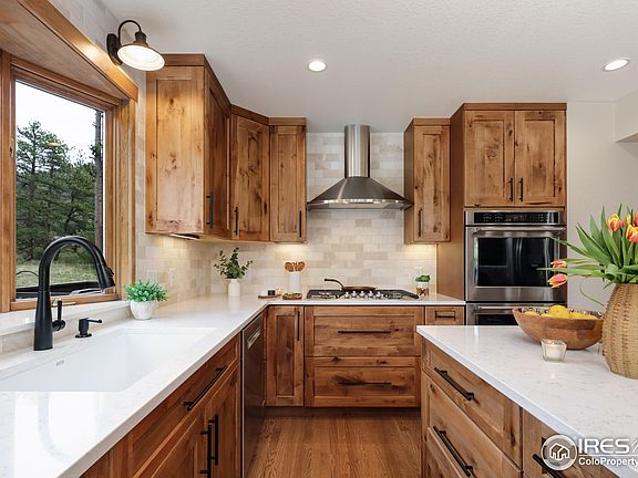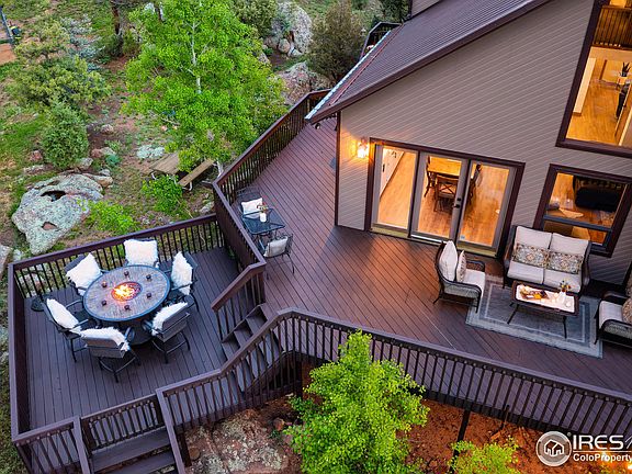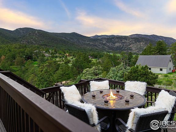 Rarely does a mountain home have everything on your wish list. This turnkey home has it all. Spacious and open 3,100+ square foot, completely remodeled 4-bedroom home with new interior finishes that are both elegant and contemporary while maintaining the character of being a mountain home in a beautiful 3+ acre setting. Inviting main floor primary bedroom with a beautiful new 5-piece luxury bath with stand-alone soaking tub, separate shower, dual vanities, and walk-in closet. Large, culinary island kitchen with high-end stainless steel appliances, quartz counters, soft close maple cabinetry, double oven and gas cooktop. Entertaining is easy with multiple gathering spaces indoors and on the wraparound deck that overlooks the foothills of Roosevelt National Forest. Dramatic lodge-style living room with vaulted ceilings, floor-to-ceiling rock wood-burning fireplace and huge windows to take in the views. Second level has a loft ideal for office or hobby space and 2 additional bedrooms. A 4th bedroom and guest bath is in the basement/garage level. Incredible storage includes large pantry, lots of built-in cabinetry and shelves to help keep your home organized. 4-car attached garage with workshop space and large utility room has enough room for your cars (depending upon size), mountain toys and workshop space to set up your tools or hobbies. The home is perched on over 3 acres that backs to national forest and includes a large chicken coop, ample parking and beautiful land with large evergreens and unique rock outcroppings. Access is easy and roads are well-maintained by a neighborhood Larimer County tax district. Water is provided by Pinewood Springs Water District. No HOA! The location is ideal - downtown Lyons is only 10 minutes away. Estes Park and Rocky Mtn National Park are just 15-20 minutes up the hill. Boulder and Longmont are a short 30-min drive from this close-in, popular mountain neighborhood. Don't miss this gorgeous mountain home that truly has it all.