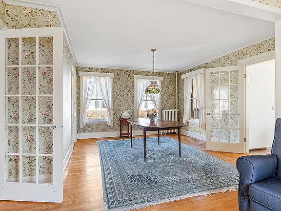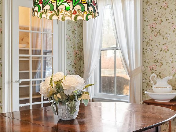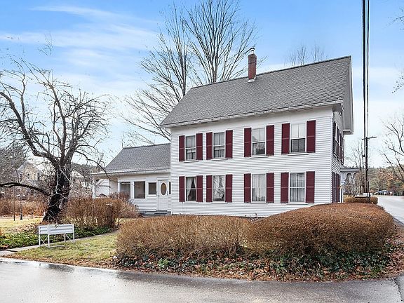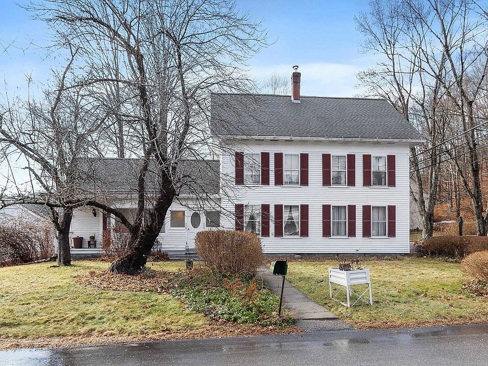 This home, at 56 Burns Hill in Wilton, NH, has many original details offering true New England charm. It is located on a level lot with nicely landscaped side yards and room in the back to expand. There’s plenty of parking, a small outbuilding that has been used as a weaving studio, but could offer many possibilities. The long side porch is perfect for greeting guests out of the weather and a lovely spot to sit and start your day. From here you enter a large kitchen space with lots of cupboards, high ceilings, laundry and pantry. Off the back of the kitchen, there is a lovely room with with lots of windows and custom wood paneling, an ideal location for an office or playroom. The main portion of the first level hosts the large dining/family room with a built-in china cabinet and fifteen glass panel doors creating a truly special feature of this home. The adjoining living room creates a nice space for entertaining. The front hall leads to the stairway to the 2nd level. Here you’ll find the primary bedroom, two additional bedrooms and the full family bath. The home also offers a walk-up attic that is great for storage, but also possibilities for future expansion if needed. The full basement has a concrete floor, bulkhead to the backyard and interior stairs as well. Recent improvements include a brand new furnace, Generac whole house generator, water heater, chimney liner and updated wiring. It is just a short walk to Wilton’s main street. Open House 1/4 11:00-1:00