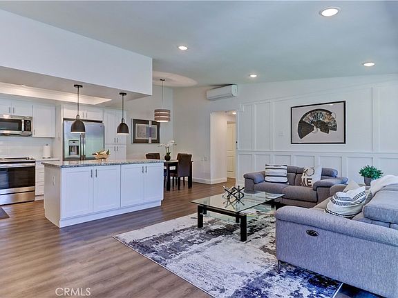 Contemporary elegance - 2BD/2BA remodeled "Casa Blanca" end-unit co-op. Recent remodel with an upscale, modern vibe! This property can be sold with furniture pieces for a vacation home or rental property. Great location on a beautiful street with close parking and short walk to the lovely Serpentine Walkway. Upper level with balcony for an elevated tree and grass filled outlook! Walk right in and you'll notice the dual pane windows, central ductless 3 zone mini-split HVAC , luxury vinyl plank flooring, recessed lights throughout, smooth ceilings, paneled interior doors, upgraded base moldings plus so much more! Open kitchen with white shaker cabinets, stone counters, stainless appliances, recessed lights and large island with pendant lighting. Adjacent, spacious living room features vaulted ceiling and beautiful wood trimmed feature wall. Covered balcony faces northwest for afternoon sun and sunset vistas. Your guests will love their gorgeous bathroom with large quartz topped vanity, tiled shower and glass enclosure. Guest bedroom houses lots of closet space and closet organizers. Primary suite enjoys an extra window for afternoon sun and cross breeze. Remodeled primary bathroom contains stack washer dryer, tub/shower combo with glass doors and added window. Close proximity to Performing Arts Center and recently renovated Clubhouse 1 with covered pool/spa, gym, bocceball, archery, shuffleboard and library. Laguna Woods Village residents enjoy a 27-hole championship golf course, a 9-hole executive par 3 course, pickleball and tennis courts, lawn bowling, gyms, clubhouses, swimming pools, horse stables, gardening centers, artist studios, computer workrooms and classes + over 200 clubs and organizations! CHECK OUT THE VIRTUAL WALKTHRU - CLICK THE WHITE CIRCLES TO WALK THROUGUH, 360 ICON TO GO OUTSIDE AND WALKING PERSON ICON TO COME BACK INSIDE