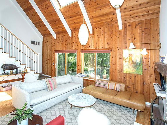 This home is not to be missed. Beautiful 2bd/1ba Fairfax home nestled among the redwoods along the San Anselmo Creek. The home enjoys amazing light with open beam ceilings and ample skylights. The kitchen is remodeled with high-end stainless appliances. A cozy dining area surrounded by bay windows opens to the living room with more windows and sliding doors showcasing the lush garden outside. On the second level a large loft provides space for an office with redwood tree views from every window. The two spacious bedrooms upstairs have double door closets and a shared full bath. The large back deck is perfect for entertaining. The backyard is like a fairytale garden with meandering paths through a rich variety of plants, trees and flowers all leading you to the creek beyond. In less than a half mile the street ends at Cascade Canyon Open Space Preserve. The home has a/c and hardwood floors.