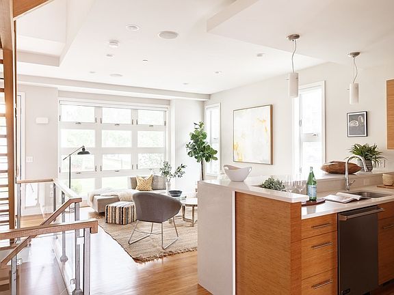 Equally livable and energy efficient, this LEED certified townhouse offers an open concept with bamboo floors and a floating glass staircase. A coveted end unit, the 2-bed, 3.5-bath home offers a built-in sound system and central vac. A voluminous living room with 8-foot windows bleeds into a sleek kitchen with soapstone counters, S/S appliances and bamboo cabinetry. Ascending upwards, an expansive main suite with private balcony and ensuite bath affords a wall of windows and 13 ft ceilings. Designed with glass atrium doors that open to a private rear patio and front porch that overlooks an adjacent green space. This Somerville beauty delivers a fully finished lower-level w/ media room, office, tiled bath, and extra storage. Set on a sleepy residential street with no through traffic, 56 Clyde is equipped with 1 deeded parking space. Located near the future Green Line Extension, bike path and Magoon Sq, this spectacular condo is an ideal urban oasis.