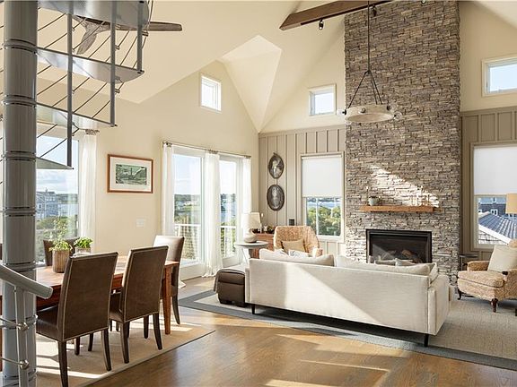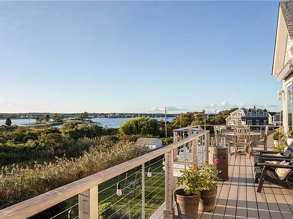Custom built in 2019, this fresh take on a classic beach cottage offers inviting spaces for entertaining inside (including living room with gas fireplace and soaring cathedral ceilings) and outside with two levels of decks for gathering, dining with friends, or simply enjoying the breathtaking sunsets. The 1878 square foot reverse floor plan home will sleep 6 to 8. In addition to the primary bedroom with en suite bath and a second bedroom there is a flex room currently used as a guest room/den; 2 additional full bathrooms; and a bright home office (or extra sleeping space) at the top of an architecturally dramatic spiral staircase. The home features a thoughtfully curated mix of materials and high-end finishes, including custom stained hardwood oak floors throughout the house, European bathroom tile, and custom cedar & cable interior banister and exterior deck railing. Other notable features: Full-house Kohler generator; Navien combo boiler with on-demand hot water; Zoned heat and AC; Commercial grade dehumidification in crawl space; and motorized Sunbrella awnings on the top deck. Walk down the street to sandy beaches, dining and the Block Island Ferry.