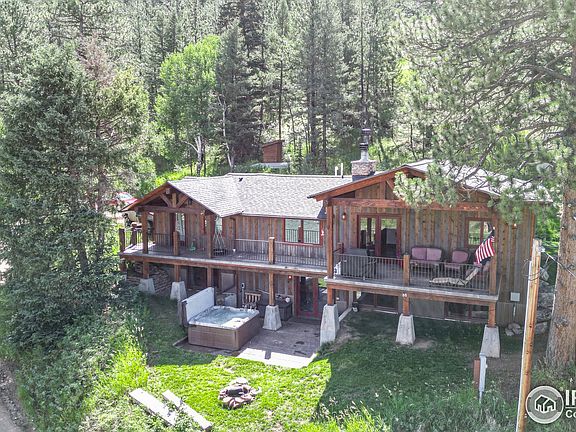 Welcome to your dream home nestled amidst the beauty of rolling hills and the serene West Creek. This stunning property, completely remodeled in 2018, offers a blend of modern luxury and natural charm. As you step inside, you're greeted by the warmth of luxury vinyl plank flooring that extends throughout the main level. The kitchen boasts quartz countertops adorned with stainless steel appliances and a spacious island, perfect for culinary adventures and casual gatherings alike. The main level also features a cozy fireplace, adding an inviting ambiance to the living space. From here, step out onto the expansive deck that spans the entire length of the home. Crafted from maintenance-free stamped concrete, this outdoor oasis is ideal for al fresco dining, entertaining guests, or simply relaxing. Retreat to the primary bedroom, where deck access allows you to wake up to the tranquil sights and sounds of nature. The ensuite luxurious bath has beautiful custom tile work. Venture downstairs to discover a versatile lower level offering ample space for relaxation and entertainment. A second fireplace graces the family room, creating a cozy atmosphere for evenings spent indoors. Two additional bedrooms, a full bath, and laundry facilities complete this level, providing convenience and comfort for all. Step outside to the lower-level patio, where a hot tub awaits, offering the perfect spot to unwind and relax. Beyond the patio are a large grassy area, a storage shed and a chicken coop. This property is adjacent to Roosevelt National Forest. The Crosier Mountain trail is just steps from your front door! With its blend of luxurious features, stunning views, and prime location, this remodeled retreat offers a rare opportunity to experience the best of both worlds - luxurious living amidst nature's splendor. Don't miss your chance to make this exquisite property your own and embark on a lifestyle of unparalleled comfort and serenity.