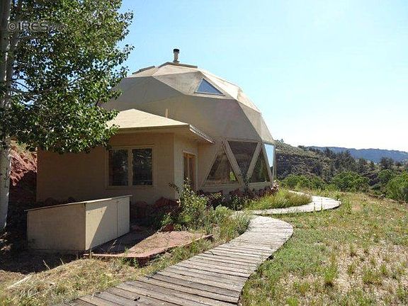 Wonderful views of 90 plus acre outlot with Little Thompson River running through. A real artist's retreat, dome style house with soaring ceilings in great room. Kitchen has stainless appliances, Lyons sandstone floors, and lots of cabinet space plus pantry, water softener, and back up generator. Huge triangular windows , patios, a kiva with electric service, and flat areas with natural vegetation. 2 bedrooms, two baths, and a laundry room. Mitigation around property lessens the fire danger.