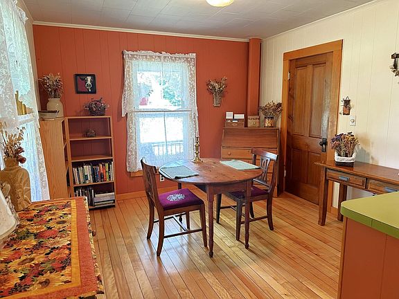 This wonderful village home is situated in a nice neighborhood off the beaten path but walking distance to the village and has been beautifully maintained. Fresh paint on the exterior & metal roof means no major outdoor projects, giving you ample time to enjoy the extensive flower gardens, the private back yard with flower gardens, the lower terrace lawn or your lovely wrap-around covered porch. Enter the front door into the foyer and immediately feel at home with hardwood floors, wood trim and wood details in a warm honey tone. Turning right brings you into the dining room which is open to the spacious kitchen with ample cabinetry and counterspace. A short hall leads you to the sitting room that is open to the living room, both rooms offering much desired natural light & beautiful hardwood floors. A full bath finishes up the first floor. Head up the wooden staircase to find a spacious bedroom with large walk-in closet. There are two generous sized additional bedrooms. A half bath with direct access from one of the bedrooms. The full basement is clean & dry hosting a laundry area, work area, storage and utilities. If storage is what you need, this home has a few options to include the attached cold storage room with built-in cabinets or head out back to the large, detached outbuilding for your lawn & garden equipment, toys and hobbies. Well maintained to move in & enjoy immediately but also allows room to make your own personal touches if desired. Don't delay, call today!