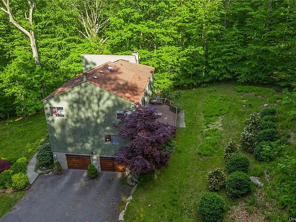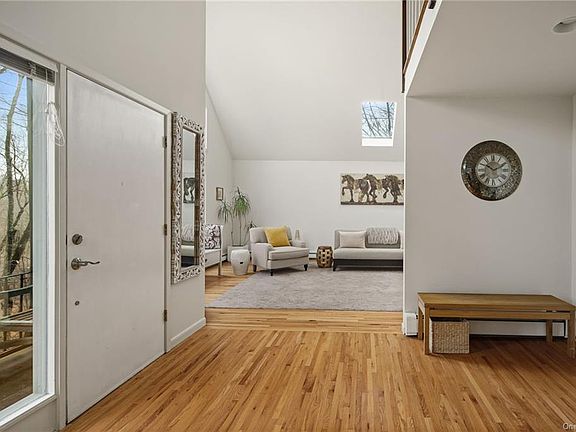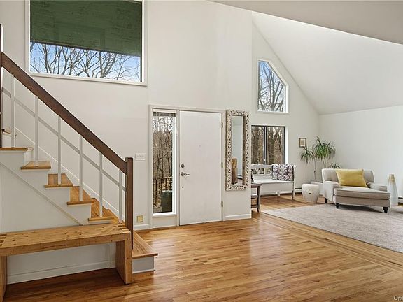 Bright and airy four bedroom contemporary set on a 2.25 acre knoll within a peaceful walking/biking neighborhood. The open flow and flexible floor plan are perfect for today's lifestyle of casual living, entertaining and working from home. Take in the natural light as you enter the two-level foyer which flows into the living room with cathedral ceiling, oversized windows and skylights providing an instant wow factor. Enjoy cooking in the eat-in kitchen with center island which opens to a great room with fireplace and dining room. The primary bed/bath and additional three bedrooms are well-proportioned. Hardwood floors throughout. Enjoy entertaining on the rear deck overlooking the gently sloping backyard. Walking distance to hiking trails, minutes to Scotts Corners, school, award-winning golf and The Inn at Pound Ridge by Jean-Georges. Note: central A/C on the second level only.