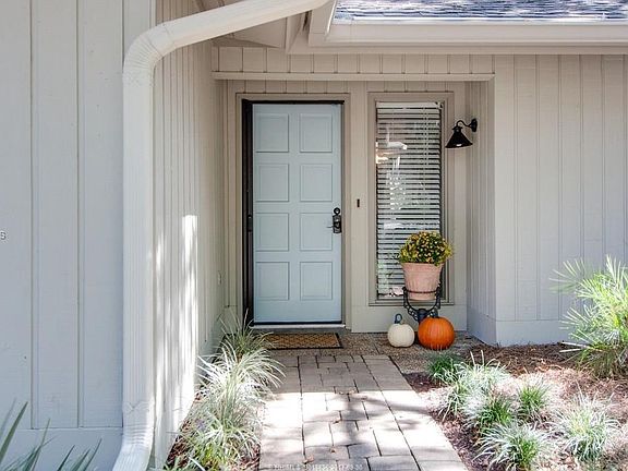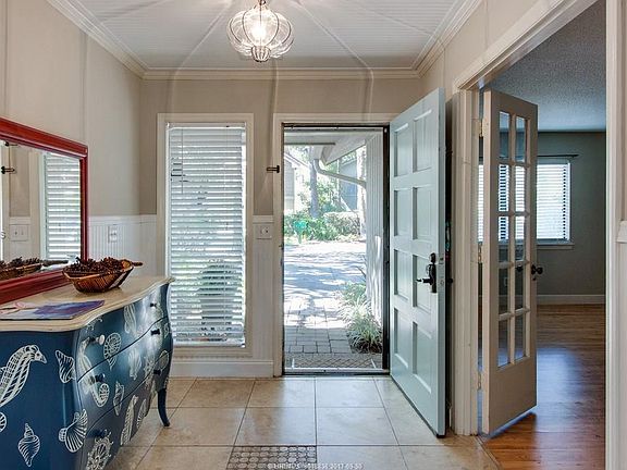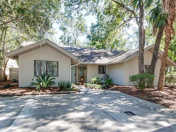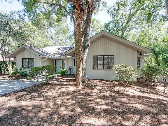 THE perfect beach cottage! One level living in charming cottage with "WOW" LAKE VIEW! Carolina porch overlooks pool and lake. 3 bedrooms, separate dining room, fireplace, wood floors, den, beadboard ceilings and walls, newly painted exterior and interior, walk to beach. Landscaped and furnished and shows nicely. Move-in ready. This house is an excellent alternative to a villa. No regime fees. The adjacent lot to the right of the home is Sea Pines permanent green space.