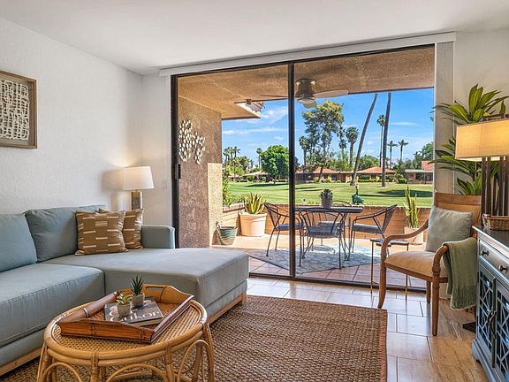 Welcome to 56 Majorca Drive in Rancho Mirage -- a beautifully renovated home within the guard-gated community of Sunrise Country Club. This charming 1-bedroom, 1.5-bathroom renovated condo offers 854 square feet of open concept living space and combines comfort and resort-style amenities in one of the desert's most desirable locations.Step through the new front door, featuring a rain glass panel, and into a thoughtfully designed home that has been tastefully upgraded throughout. The popcorn ceilings have been removed, and the interior has been freshly painted. Elegant new tile flooring runs throughout the home, complementing the bright, open-concept layout that is perfect for both everyday living and entertaining.The kitchen has been modernized with porcelain countertops, a coordinating backsplash, and new cabinetry. A double-pane window with a remote-controlled shade offers natural light and views, while a new sink, fixture, and garbage disposal add convenience and functionality.The spacious primary suite features a new 1-ton mini split A/C unit, a double-pane sliding door, and updated window treatments. The en-suite bathroom has been completely renovated with a walk-in shower, high-end Grohe fixtures, a Toto toilet, and sleek finishes throughout. The powder room has also been updated with a new vanity, mirror, Toto toilet, and exhaust fan.Additional upgrades include new exterior light fixtures, a Ring doorbell, Whirlpool washer & dryer located in the garage, and a new LiftMaster garage door opener.Enjoy your morning coffee in the private front courtyard with mountain views, or relax on the expansive rear patio overlooking the serene golf course.Residents of Sunrise Country Club enjoy exclusive access to an array of amenities, including an 18-hole executive plus golf course, tennis and pickleball courts, multiple pools and spas, a vibrant clubhouse, and a well-equipped fitness center. Ideally located just minutes from premier shopping and dining at The River and El Paseo, and only a short drive to Palm Springs International Airport, this home offers the ultimate in desert living.Whether you're looking for a seasonal escape or a full-time residence, 56 Majorca Drive is move-in ready and waiting for you.