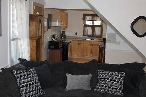 This home is all about charm! From it???s front covered porch where you can have your morning coffee, after work wine, or just sit and relax, to as soon as you walk in the front door and are greeted with an open concept living, kitchen, and dining area, you will know you are home! The second floor offers 2 bedrooms with vaulted-edged ceilings just adding to the character of this great home. Step out onto your deck into a beautiful large fenced-in yard. With some TLC, this home???s possibilities are endless.