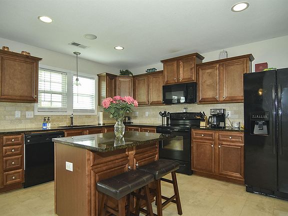 - RoomKitchenFeatures: Granite Counters, Kitchen Island, Recessed Lighting, Eat-in Kitchen, Cabinets-Natural, Floors-Tile, Backsplash-Tiled