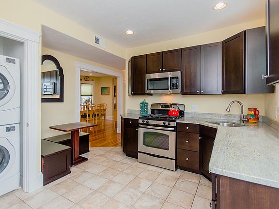 Pristine, tastefully renovated 2 bedroom, 2 full bath, top floor condo. This sun-filled unit has a gracious layout with living room with gas fireplace and a large dining room. Kitchen boasts sleek, espresso cabinetry with granite countertops, stainless steel appliances and washer/dryer. Master BR has multiple closets and upscale en-suite bath. Spectacular views from large back porch. Roof rights, too! Parking, central air and basement storage. Five minute walk to Commuter Rail and close to supermarket and Roslindale Village.