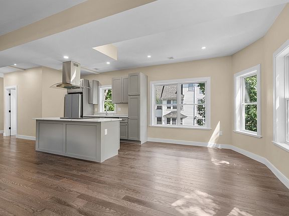 Huge price drop! Fully-renovated, upper duplex minutes to Roslindale Village on a tree-lined side street. 3 bed, 2 full bath home situated on the second and third floors, boasting garage parking w/ EV outlet, private front entrance, shared back yard and oversized front porch. Expansive open floor plan on main level encompasses living & dining rooms with tons of natural light and treetop views. Gorgeous kitchen anchors the space with a central island and range hood. There is also a bedroom & full bath on the main level. Upper level offers 2 additional bedrooms & 3/4 bath. You’ll find large windows, LED recessed lighting, in-unit laundry, & abundant closets throughout. Renovation included all new systems & Green technology for low energy use, 200A electrical, heat pumps, spray foam insulation, Samsung appliances, + induction cooking. Additional driveway parking available; ask for details. Includes 1 year builder warranty.