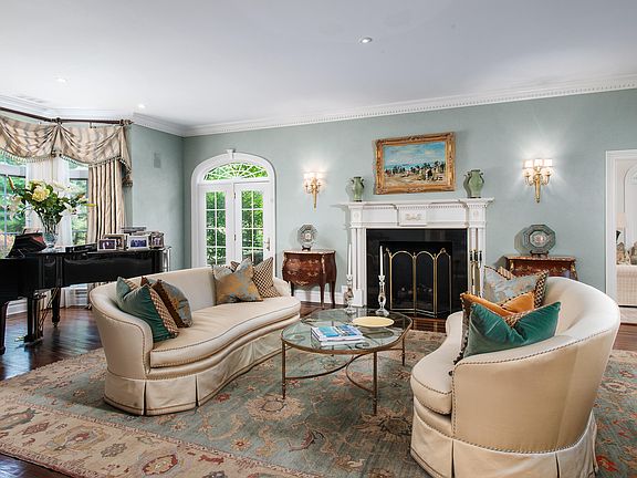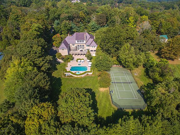A gated drive sweeps to the circular court of this picture perfect English Manor-inspired residence, secluded on 2.59 lush, level acres. Introduced by a dramatic 2-story foyer, the inviting interiors feature 7 fireplaces, a mahogany library, sunroom,''pub room'' w/ full bar, billiard room, home theater, sauna, gym & spacious wine cellar. Opening off the chef's kitchen w/ marble counters is a double-height family room w/ stone fireplace. The master suite is generously scaled to include 2 baths & is one of 6 bedrooms in the sizeable floor-plan. Outdoors, covered & open south-facing terraces surround the pool & spa with adjacent fountain & tennis court. Garden walkways lead among beautiful plantings to a 1-bedroom guest house w/ kitchen, full bath & loft. There are garages for 5 cars.