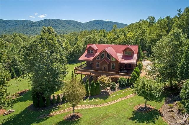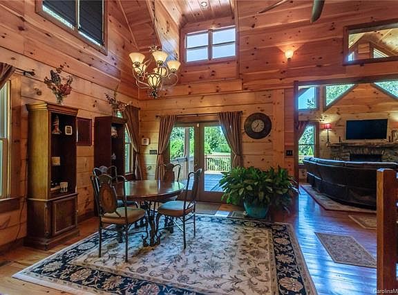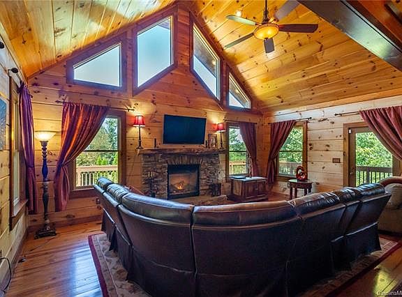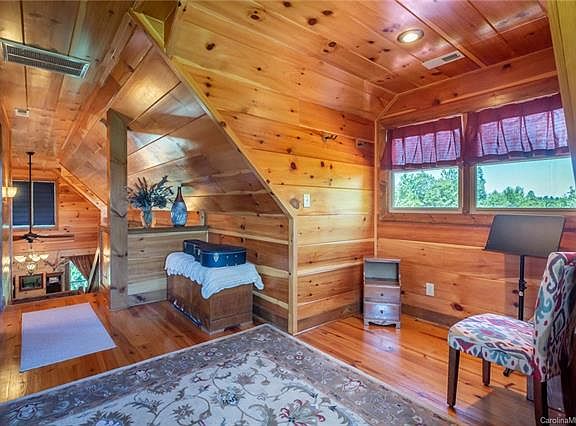 Private log home in gated community. Cozy cabin on 6.46 acres with long range views of the Blue Ridge. Open floor plan has kitchen with island and informal dining. Great room has cathedral ceilings with gas fireplace and access to wrap around deck. Main level master suite, second bedroom and laundry room with half bath. Upper level loft style bedroom or office with full bath. Full unfinished basement has stub out plumbing for adding additional bath. Great storage space or can be finished with extra living space. Propane fueled full house generator, on demand hot water and gas backup heat. Beautiful landscaping and privacy on over 6 acres on 2 combined lots.