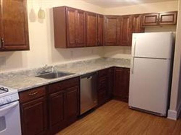 Every surface of this apartment has been re-done Stainless appliances, tons of cabinets and wood laminate floor in kitchen....carpeted living room and bedrooms....lots of closets for storage! Lovely home in a convenient location--walk to downtown and only minutes to highways. Laundry in building; use of yard and inground pool....off street parking....this one won't last NO PETS, no exceptions please Available May 1st