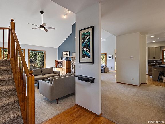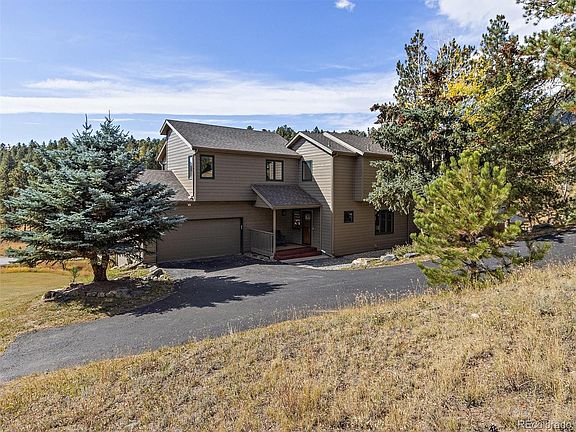 Beautiful meadow and mountain views abound from this home situated on an acre plus lot with a seasonal stream. The location of the home provides tons of sunlight and lovely areas to entertain and dine. Dual sided moss rock fireplaces highlight the main level living and family rooms. The kitchen has been updated with high end appliances, quartz counters, custom cabinetry and 2 islands. Main level also has a spacious dining room and a private office. Don't forget to check out the main level deck with no maintenance decking, access to the family room and kitchen, amazing views and plenty of sunshine. The upstairs features a generous size master suite with a 5-piece updated bath and 2 additional sunny, bright bedrooms with a shared bath. Entertain guests in the walk-out lower-level over-sized family room complete with a wet bar, private bath and bedroom. This close in location offers high speed Century Link internet, public sewer and easy access to Evergreen amenities. Only 10 minutes to Evergreen Lake (take the scenic route on Upper Bear Creek Rd.), only 15 minutes to I-70 with access to the mountains or Denver and less than 5 minutes to the closest elementary school (King Murphy). Parking for Elk Meadow hiking and biking is only minutes away off of Stagecoach Blvd. Open House scheduled for Saturday, October 9, 1-3pm.