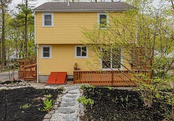 Beautifully redone Garrison Colonial on a convenient side street is just waiting for new owners! Inviting open flow for entertaining or relaxing. Spacious living room, Dining room w/ French doors to a deck, gorgeous Kitchen w/ granite/stainless/white cabinets + an island/breakfast bar, gleaming hardwood floors, wrap-around deck off the Kitchen & Living room w/ built-in planters, & a remodeled half-bath. 3 bedrooms up w/ good closet space, & a wonderful porcelain tiled redone bath. Though currently not heated, the basement space has pantry shelves at the stairs & is brightly lit - future playroom perhaps? Newer roof & windows, & the entire house was recently painted inside & out. Plenty of off-street parking & room to roam & explore on this half-acre lot of land. A pair of Hi-efficiency Bosch energy star heat pumps to keep you comfy & cozy year-round. Updated electric & plumbing. Short drive to Route 3 & into Boston, & Whitman's Pond for water recreation. Truly move-in condition!