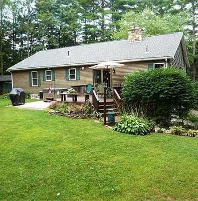 Looking for a beautiful house where you can have a horse too? Look no longer. House features a large kitchen with many gleaming cabinets, granite counter tops, recessed lighting and wood flooring. Appliances are for the buyers enjoyment. Bright living room to fit many or large pieces of furniture. Cathedral ceiling, solid wood beams, stone fireplace and the entrance to the front porch. All bedrooms are spacious. Master has a full bath and walk in closet. There is a utility room for 1 floor laundry and storage. Outside you step onto a deck and patio for the hot tub. A 2 stall barn with separate electric, loft for the hay, paddock with electric fence and pasture. You will find beautiful gardens, flower pond, shed and a small kennel. Private setting. A short drive to the MA pike and shopping. This is such a unique offering. Take the time for a private showing TODAY!!!