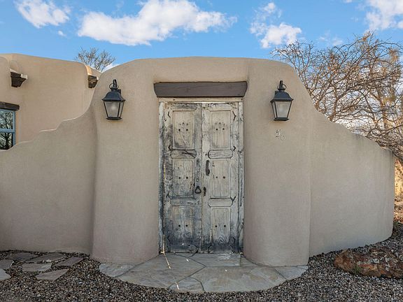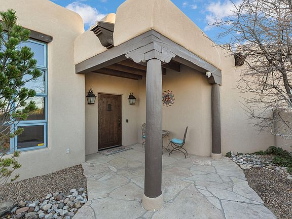 Experience refined Southwestern luxury in this custom single-level home in the prestigious Placitas Trails community. Thoughtfully sited for privacy & sweeping mountain views, this property blends open-concept living w/ charming brick floors, beamed ceilings & abundance natural light. The kitchen is the heart of home w/ high-end appliances, butcher block island, walk-in panty & generously sized breakfast nook. The serene primary suite offers a spa-like bath w/ his/hers vanities, walk in shower, separate tub & spacious walk-in closet. Additionally, there's 3 giant guest bedrooms + formal office. Exceptional craftsmanship throughout: wood windows, TPO roof (2024), plaster walls, newer carpet & all of the brick flooring has recently been resealed (11/25)! Relax and enjoy the covered patio &