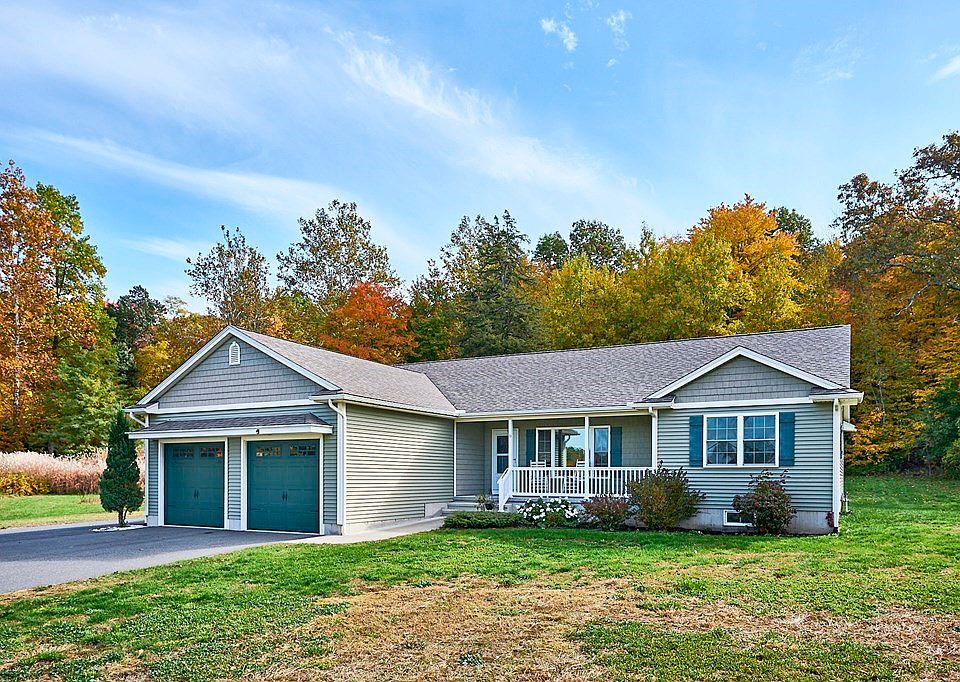 Multiple offers received, highest & best offers do Sunday, Oct. 23rd at 5: 00. Spacious ranch nestled on 1.5+ acres with sweeping hillside views. This well-appointed home features large living room with cathedral ceilings and 2-sided gas fireplace, and kitchen with granite counters, stainless appliances, and breakfast bar that opens to the gracious dining room. The adjacent heated sunroom has 3 walls of windows and atrium door to rear yard. The 1st floor primary suite has private bath and walk-in closet. Also on the main level are 2 additional bedrooms, another full bath, and a separate laundry room. Sit and take in the long views from the front farmer’s porch or relax on the deck and large Goshen stone patio in the big backyard. The living is easy with oversize 2-car attached garage, central air, handy shed, and gas utilities, plus full, useable basement. Conveniently located minutes to Easthampton, the bike path, shopping, and the highway. The ultimate in one floor living!