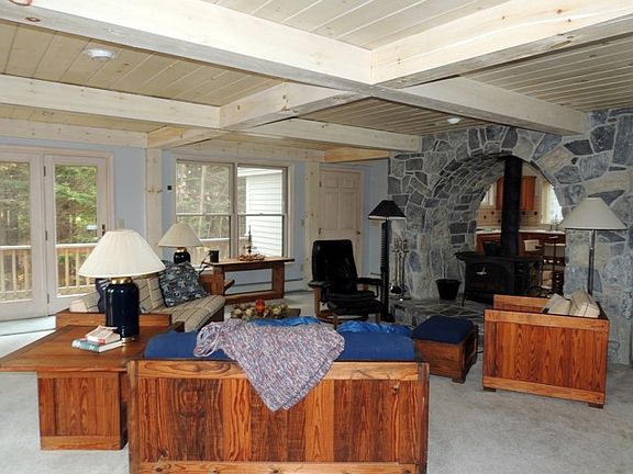 Located down a private drive this contemporary boasts river frontage with dock. Enjoy an open concept kitchen, living and dining area wrapped in glass and stone. First floor master suite with wall of glass to bring the view to you. The second floor has one finished bedroom and one partially finished with bath. The lower level has a partially finished office with stone and wood stove. The extras are an over-sized two car garage, wrap deck, and views of the river and golf course to quiet any soul.