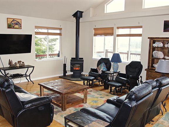Captivating waterfront living! 113'of sought after water frontage with private dock. Enhanced by almost an acre of land. Includes 3,671 sq' home offering vaulted ceilings, open floor plan with Kuma wood stove on main floor, spacious light and bright rooms with spectacular views. Home boasts two floors of complete living quarters with separate entrances. Expansive water views from all floors with inviting wrap around deck. Main floor gourmet kitchen with island, 5 burner convection oven and oak floors. Stunning Master Bath features sunken tub, huge shower, and dual vanities. Two impressive sized buildings that offer shop, storage and 5 car parking, Mature grapes, apples, pears and plum trees in fenced garden.This upscale home highlights the perfect lifestyle. Bring an offer!