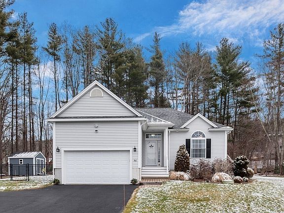 Stunning young one-owner contemporary ranch ideally located at the end of a quiet cul-de-sac with western views for lovely sunsets! Enjoy the well landscaped yard surrounded by woods from your private deck. The interior features open living/dining/kitchen space enhanced by 9 foot ceilings, a cozy propane fireplace, granite counters, dining peninsula, fully applianced modern kitchen w/mega cabinets. The spacious main BR has a walk-in closet and a luxurious bath with a soaking tub & separate shower. The other 2 BRs with another full bath are located at the opposite corner of the house. This quality energy efficient home has 2X6 construction, central AC, solar panels, full basement for clean dry storage, large workshop space and the option for additional finished living area. The 200 Amp elec service is generator ready - generator negotiable. Leased solar system will convey. Beautiful one level home is MOVE-IN READY - ALL SET TO ENJOY with a side fenced yard and spacious storage shed.
