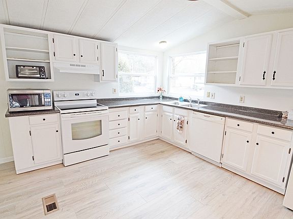 Why Rent when you can Buy? This Lovely Home has been completely remodeled and is in Move-In condition. The Home features a wonderful Open Floor Plan throughout with Cathedral Ceilings and a large picture window looking out from the large eat-in kitchen. The neutral paint tones and new laminate flooring flows from the Kitchen through the Dining & Living Areas making for a large open & cohesive look. This home has 3 bedrooms, a large remodeled full bath and an in unit full size laundry area w/storage. Outside the home sits on a large corner lot with a covered patio, great for summer barbecues! The large yard boasts a Storage Shed conveniently located adjacent to the home and an Apple Tree out back. When you add in off-street paved parking, what more could you ask for? Book your showing today, this unit will not last! Mobile homes are sold "as is". Financing is available with a 650 Credit Score. Just minutes from the MA Pike!