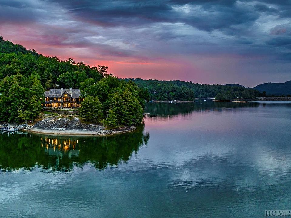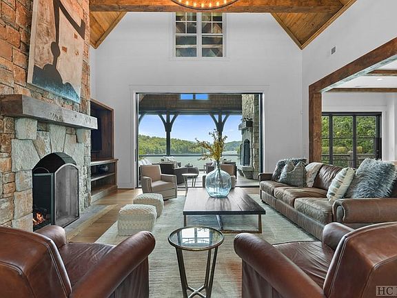 Discover this stunning new estate on the picturesque Lake Glenville, nestled on the Cashiers/Highlands Plateau in the mountains of Western North Carolina. This luxurious home sits handsomely on the most beautiful stone point on the lake, boasting an elevation of around 3,500 feet and offering pleasant summer temperatures and fabulous lake living. This premier estate features three deluxe primary suites, each complete with its own fireplace, captivating lake views, and spa-inspired baths boasting indulgent soaking tubs and heated floors. Additionally, there are two more ensuite bedrooms, perfect for hosting family and friends, as well as a spectacular wood-paneled home office with exceptional lake views and fiber optic high-speed internet, ensuring you stay connected while immersed in the tranquility of the mountains. The great room exudes warmth and grandeur with an exceptional stone fireplace, a reclaimed barnboard ceiling adorned with antique beams, and expansive glass pocket doors that effortlessly slide open to reveal the inviting outdoor covered porch. The large chef's kitchen provides everything an accomplished or aspiring chef could desire, and the spacious bar welcomes exceptional entertainment. A well-appointed outdoor kitchen and barbecue areas await your entertaining pleasure on both the upper and lower decks. Additional amenities include a recreation room, spacious home gym, sauna, and jacuzzi. The unique wine cave with its rock outcroppings promises memorable evenings of tasteful indulgence. This property sits on a generous 1.5-acre lot with approximately 400 feet of lake frontage, featuring a spacious dock, sandy beach, and a cozy firepit. Lake Glenville is one of the most beautiful lakes in America, boasting mesmerizing waterfalls and surrounded by 16 majestic mountain peaks. This home is a rare gem, offering unparalleled luxury and the ultimate mountain and lake living experience.