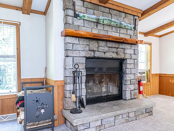 Cozy stone-hearth fireplaceTwo storage shedsSoaring cathedral ceilingsExposed wood beamsPrimary suitePrivate bathSpacious open-concept living