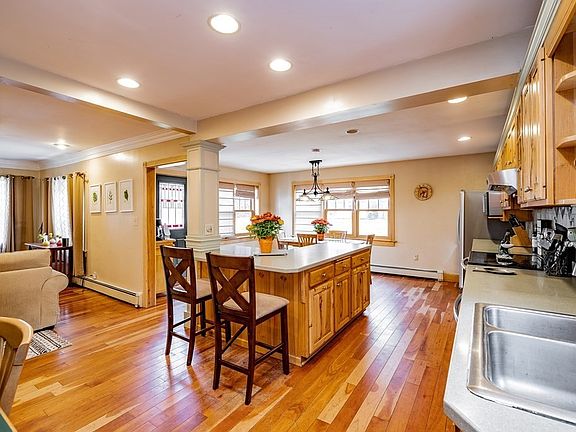On the Hill in Turners Falls is where you will find the home you have been looking for! This home has it all! 4 bedrooms, office/exercise/ play room or classroom. The main level offers an amazing updated kitchen with breakfast bar island, stainless steel appliances, built in desk and a fantastic open floor plan to the living and dining areas. Gorgeous wood floors! Wood Stove makes the whole home cozy. First floor also offers a generous sized master bedroom, bedroom #2 and a full bath. 2 additional bedrooms on the second level. The basement gives you 2 more finished rooms to suit your needs and a half bath! Breezeway is also finished and leads you to the backyard oasis featuring a koi pond, inground pool, deck and fire pit! All this could be yours. Make your appointment today!