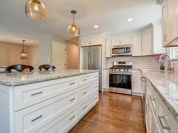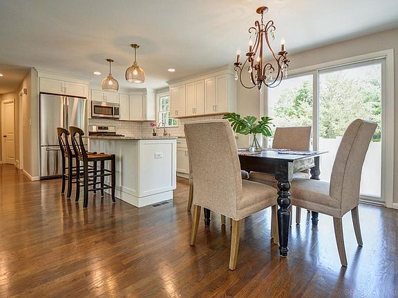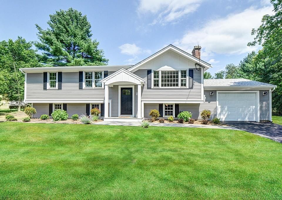The arched portico welcomes you to this completely renovated in 2017 home with 1,870 SF, 4 bedrooms & 2 full baths. This home has been thoughtfully transformed from top to bottom with high-end finishes and gleaming hardwood floors. This open floor plan is ideal for entertaining. The sparkling white kitchen has shaker style cabinets, a large island, granite countertops and stainless steel appliances. The living room's focal-points are a board and batten fireplace and a large picture window. The dining room's slider opens to a large low-maintenance deck overlooking an expansive, professionally landscaped yard. The first floor has three bedrooms all w/ hardwood floors and a full bath with a double vanity with granite countertop. The stylishly updated lower level has a mudroom with built-ins, nicely sized family room, 4th bedroom or office and a spacious laundry room. Energy efficient (Mass Save approved) and move in ready with a low maintenance exterior and attached 1 car garage.