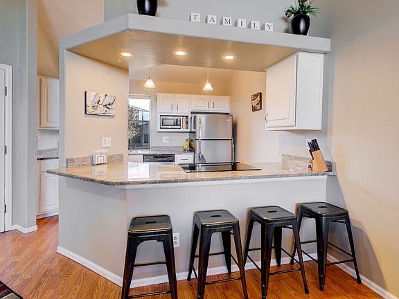 Beautiful Point of the Pines townhome with awesome views and backing to picturesque open space! Open floor plan with 2 large bedrooms and 2 full bathrooms with attached full bath in master bedroom. Move in ready with modern kitchen, granite counters and nice flooring. Living room has vaulted ceiling and wood burning fireplace and walks out to large composite deck to enjoy the incredible views. Also includes 2 parking spots with 1 being a covered carport. There is also a storage space accessible on back deck. Assigned parking for 2 cars but only 1 space is in the carport. Maintenance free living in a quiet condominium community with HOA taking care of common utilities, trash removal, exterior maintenance, lawn, snow removal, as well as water, sewer and insurance. Complex also features a pool, clubhouse and exercise room and is close to hiking, biking and about 80 acres of Ute Valley Park trails.