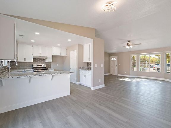 Welcome home! This stunning 3-bedroom, 2-bath residence offers 1,420 sq. ft. of beautifully remodeled living space. It is designed with style, comfort, and functionality in mind. Step inside to discover an open and airy floor plan with brand-new flooring, fresh paint, and modern light fixtures throughout. The spacious living room is perfect for relaxing or entertaining guests. The heart of the home features sleek white cabinetry, striking granite countertops, a classic subway tile backsplash, and stainless steel appliances. Both bathrooms have been fully updated with granite vanities, new fixtures, and a clean, modern design that feels fresh and inviting. Situated on a generous lot with plenty of room for gatherings, gardening, or creating your dream outdoor space.