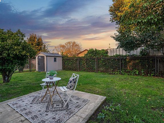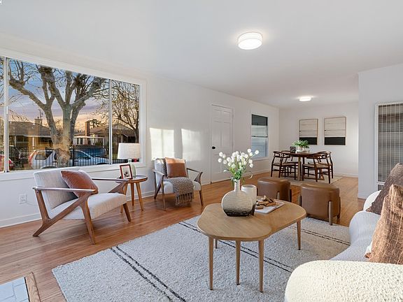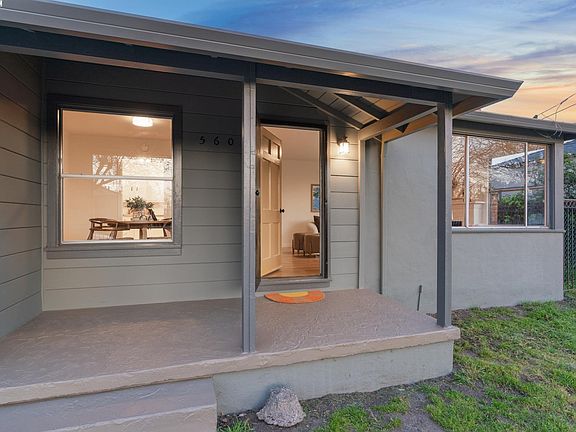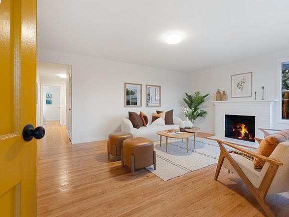Easy living awaits in this upgraded, single-level 3BD/1BA Mid-Century home in Oakland’s Sobrante Park. From the neighborly porch, step inside the bright living area where sunlight streams from picture windows with views of the tree-lined street. An open floor plan provides space to relax in front of the cozy fireplace or dine next to the adjacent kitchen. Recently refreshed, the kitchen has updated tiling, counters, lighting, and flooring. There is convenient interior access to the large one-car garage with laundry hook-ups and storage, and the kitchen’s backdoor leads to the expansive backyard for great indoor/outdoor living. You can dine al fresco on the patio near the bountiful orange tree, play ball on the level lawn, relax on another patio surrounded by mature landscaping, and enjoy the shed as a workspace or storage. Back inside, gorgeous refinished hardwood floors span the living and sleeping areas. Three sunny bedrooms are tucked down a hall for privacy and quiet and share a renovated full bath. The bedrooms all have large custom closets and greenery views. The entire property has secure fencing and multiple parking spaces within. Sought after K-12 charter schools are down the block, and lively Old San Leandro is nearby, as is San Leandro BART for a convenient commute.