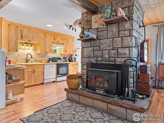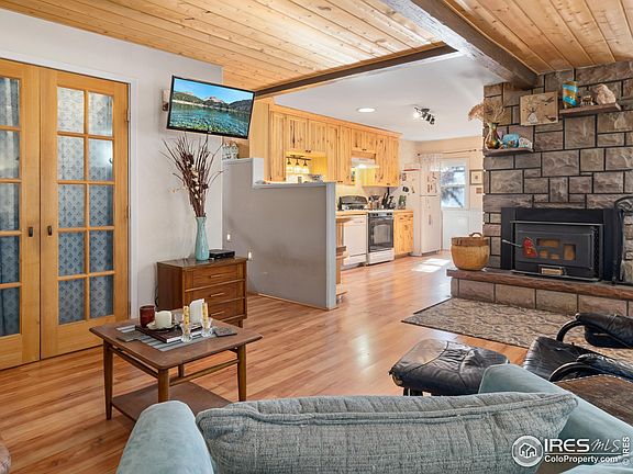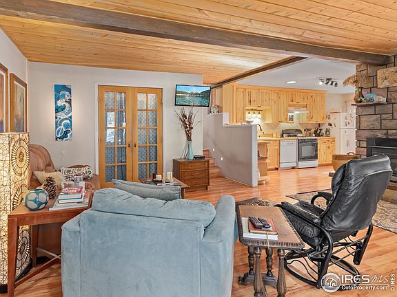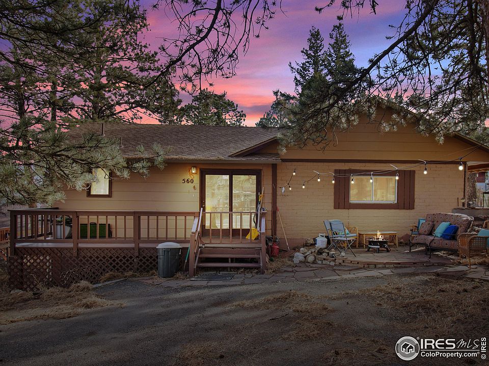 Affordable mountain home offers 3 bedrooms and 2 bathrooms. Highly desired main level living with open floor plan. Living room has wood ceilings and an incredible stone fireplace with insert for chilly days. Open kitchen with Hickory cabinetry and gas range opens to a nice patio plus separate dining space. Primary suite offers full bath with separate vanity and laundry room close by. At the opposite end of the house are two more bedrooms, updated full bath, office space with built ins and large family room with wood floors. Corner lot with plenty of parking plus a deck and patio shaded by the pines. Enjoy the view of Twin Owls plus a perfect spot for the 4th of July fireworks over Lake Estes. The unfinished basement is only accessible from outside but is great for a storage/craft/workshop area. Nice location to downtown Estes Park, schools and Rocky Mountain National Park.