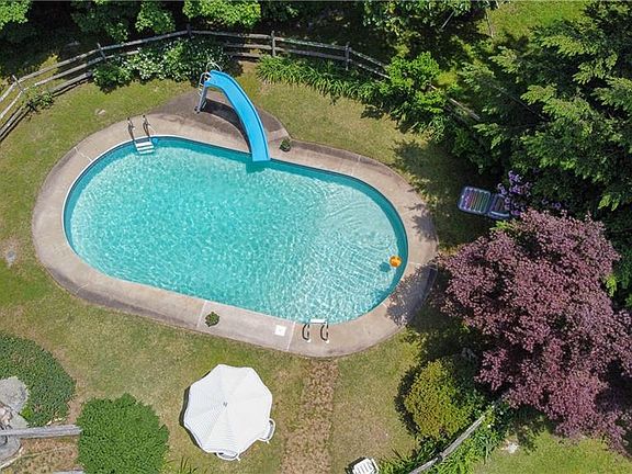 Vacation at home 2/3 Bedroom cape on park like grounds with an in-ground stunning pool. The grounds are nicely landscaped with many perennials that pop up different times during the season. The back of the property is bordered by aquarion property then trails. The house has been well cared for and has a brand new roof with custom flashed chimney, vinyl siding and most windows have been replaced. The house also has Central air/FHA oil heat. Main level has large living room with brick fire place flanked by built-in book cases and huge picture window overlooking pretty front yard. Dining/den has huge dining area also with picture window opens to cozy den w/ woodstove that saves alot of fuel dollars and ceiling fan. Kitchen has been remodeled with new cabinets, appliances, tile floor, granite counters, has two hidden pantry closets, access to patio and full bath. Huge main level master Bedroom has ample closet space and huge picture window that over looks the park like back yard. 2nd main level bedroom is tucked away for privacy. Upstairs has third bedroom with unfinished attic space that has many potential options as 4th bedroom/bath or the whole upstairs can be huge master suite many options..Oversized garage can possibly fit 3 cars opens to huge workshop/basement . Note town records states 2 bedrooms, awesome location, close to schools, shopping and rt 25. walk to scenic walking/biking trail just a few doors down.