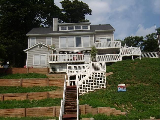 This home has awesome views and 76 feet of great beach! This home features 4 bedrooms, 2 fireplaces, spacious family room , beautiful open concept withvaulted ceilings and many windows for spectacular views, custom cherry cabinetry in kitchen with breakfast bar and dining area, large back lot with 24 x 24garage. New improvements in the last few months include: stone wall, rod iron fence, extended yard in back lot, asphalted back lot. Don't miss this one!