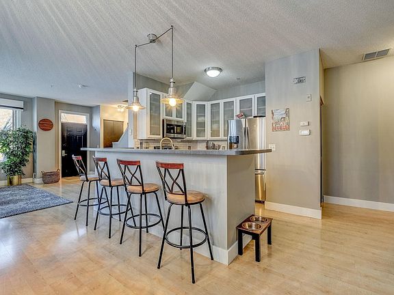 Amazing North Loop first floor, south facing corner condo with private patio, and it's own private entrance. This home has two levels, in unit laundry, heated underground parking and a storage unit on the third floor. Home has been updated throughout. Bright and open main floor with three sided gas fireplace. Kitchen with updated cabinets and stainless steel appliances.