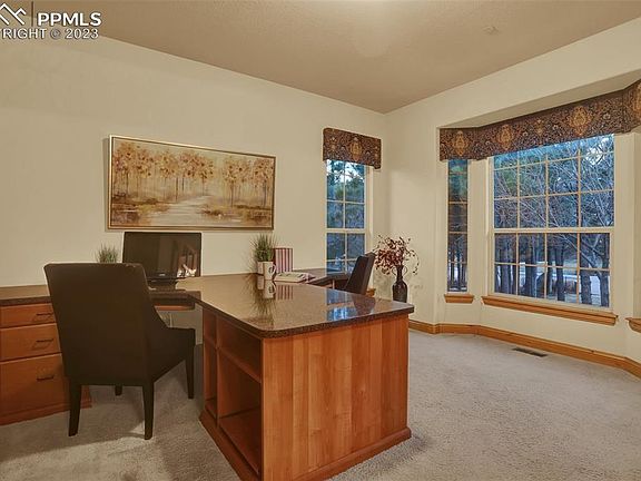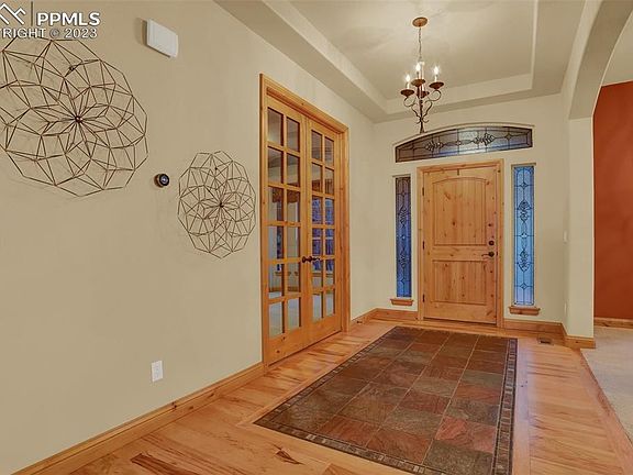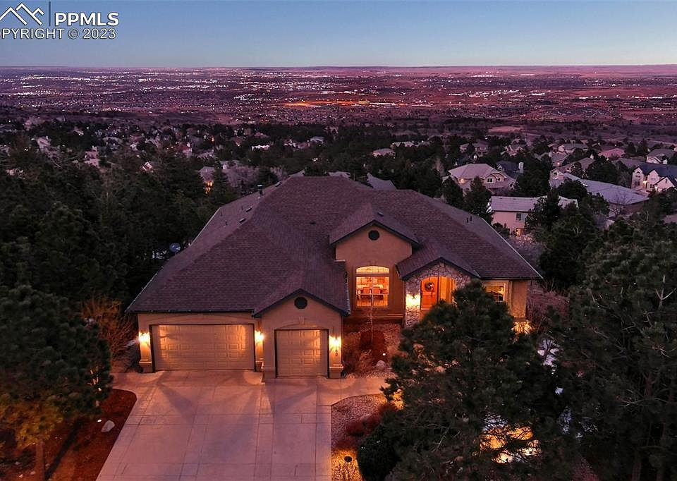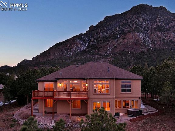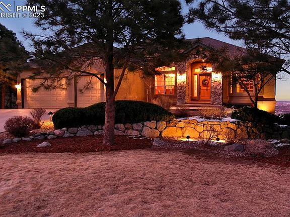 Welcome to this meticulously maintained ranch style home in Spires/Stonecliff! Feels like you are at the top of the world w/main level living at its finest! Please take a moment to enjoy the twinkling city lights AND the beautiful majesty of Cheyenne Mountain! This home features gorgeous hickory wood floors, oversized solid hickory doors and offers a main living space flooded with natural light showing off those city lights in the evening. A fireplace with built-ins beckons you to light the fire on a cold evening, or head out to the deck which provides additional outdoor living space. Also on the main level, you have a chef's kitchen with double ovens, quartz countertops and walk-in pantry and adjacent breakfast nook. Your laundry room is located just off the kitchen. The primary suite offers another chance to view those twinkling lights & en-suite 5 piece bathroom w/walk-in closet. Another bedroom and bath round out the main floor. As you meander downstairs, you are greeted by another cozy entertaining room w/ 2nd fireplace & wet-bar w/ walk out access to a stamped concrete patio (& negotiable hot tub/spa). There are 2 more bedrooms down here, (one with a murphy bed, providing multiple options for that room). This home has tons of storage, an insulated 3 car garage with workbench and built-in cabinets. There is a built-in sound system, and you can be at peace knowing you have a built-in fire suppression (sprinkler) system. The lawn is low maintenance with auto-sprinkler system. There are 2 hot water heaters, 2 furnaces, radon system & whole house humidifier. With nearby amenities, like world class golf courses, fine dining options, Country Club of Colorado, Will Rogers Shrine and The Broadmoor, along with the top rated Cheyenne Mountain D12 school district, you will definitely want to call this home. Plan to watch the fireworks all over the city in July from your own deck!