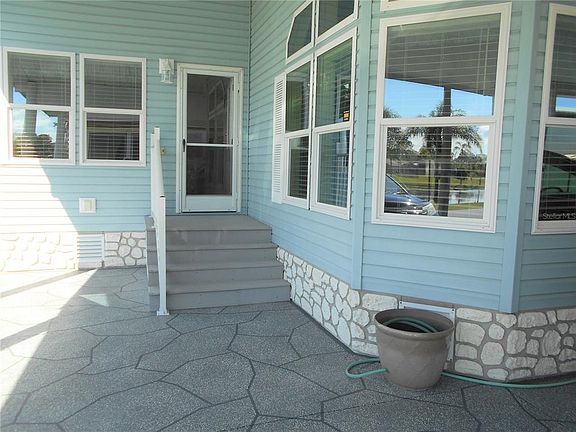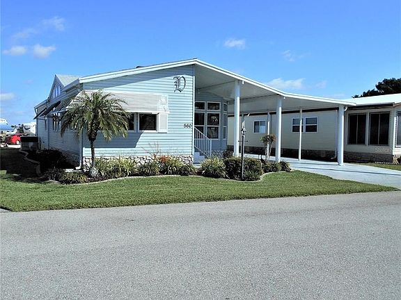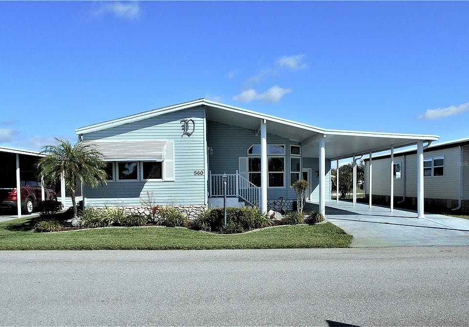 TURNKEY 2 bed/2 bath FURNISHED home in a 55+ GOLF community with access to 175 ac LAKE DAVENPORT. Step inside this home to the Bonus Room with a Flexsteel Queen sleeper sofa, and you will feel the openness! Enter into the large open living room to the spacious dining area with bay window OVERLOOKING THE POND!. The kitchen offers a double oven stove (2021), stainless steel refrigerator (2021), and dishwasher (2016). Down the hallway is the laundry (w&d 2021) with overhead storage and across the hall is the guest bedroom and bath. At the end of the hall is the large master bedroom with loads of storage, mirrored closets, and bathroom with shower. The owners have installed waterproof laminate and porcelain tile throughout. The attached storage shed is ideal for your tools and storage. The carport allows for tandem parking for two cars and the driveway has been expanded to accommodate your golf cart. This home is just steps away from the clubhouse, pro shop, community pool, recreational facilities, and post office. Other upgrades include all energy efficient windows (2012), Trane XL heat pump (2013), 30 gal hot water heater (2017), shingle roof 25 yr warranty (2018) and the plumbing has been replaced (per previous owner). This is an active golf cart friendly community located minutes away from an urgent care facility, lots of restaurants, and 5 miles to Disney. Dont let this one get away! Schedule your showing now!