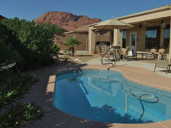 YOUR OWN PRIVATE REFUGE in peaceful Padre Canyon Estates, Ivins. Red rock and mountain views, gated RV space, and fantastic backyard with heated swimming pool. Custom 3/2.5 home with open floor plan, 1718 SF, quality upgrades throughout, bay windows, built-in entertainment center, SS appliances, Bosch dishwasher, central vacuum, water softener, reverse osmosis. Master suite sitting area, walk-in shower, jetted garden tub. Front and back covered porches. Custom BBQ, misting and sound systems on back patio. Huge RV parking with full hookups and room for all your toys! Oversized 2-car garage with half bath, workbench, built-in storage. Easy care SW landscaping and low maintenance saltwater pool chlorination system. Near end of quiet cul-de-sac, no neighbors behind. Adjacent to paved walking/biking paths. Nearby Tuacahn Amphitheatre and Snow Canyon Park for world class views and hiking. Close to Zion, Bryce, and Grand Canyon. Excellent location for RV enthusiasts!