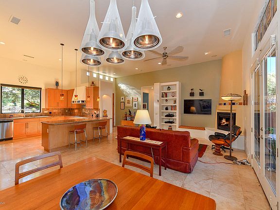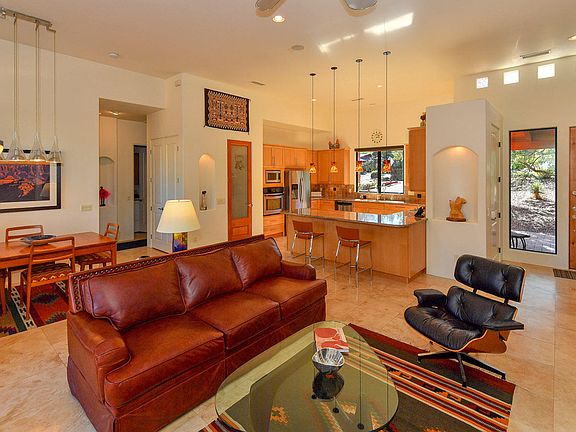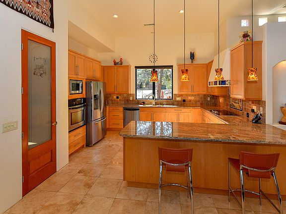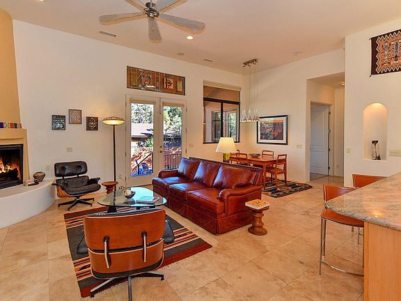 Luxury Amenities abound in this Classy 3-bedroom 2 bath single level home in prestigious Sedona Uptown location. Built in 2007 this beauty was designed with intricate artistic details; whimsical curved cabinetry hardware, corner gas Beehive Fireplace with accented bric brac tiles and extended sitting hearth, uber chic light fixtures, glass blocked accented windows, lighted niches for art pieces, and Travertine stone and wood floors. Kitchen and Baths are graced by Granite and Custom Cabinetry. Add to it the Gourmet Kitchen with Custom Kt Back splash, Gourmet Appliances and a Walk in Pantry. French Doors leading from the Living and Master Bedroom Spill out onto a covered paved deck accented with Viga Wooden Beams and wrought iron railing. Back Yard is accented with paved outdoor