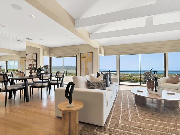 The allure of Del Mar’s coastal lifestyle beckons from this 3+ bedroom, 3.5-bathroom home showcasing spectacular, southwesterly views overlooking the ocean, Torrey Pines Reserve, and coastline to La Jolla. Situated behind the gates of a small enclave, you’re afforded the ideal balance between privacy and having a plethora of activities at your fingertips…a community tennis court, Torrey Pines State Beach, local eateries with views of the lagoon, trails, golf, as well as upscale boutiques and fine dining found in The Village and Plaza. Infused with natural light, the reverse floor plan places the primary suite and main living areas on the highest level, ensuring every moment is accompanied by breathtaking vistas. The eat-in kitchen boasts a dumbwaiter for convenience, and the open living spaces invite gathering while offering a seamless transition onto seaside decks for ease of entertaining. Upon entry through the front door, you will find the secondary bedrooms/baths, a separate living room, and a dedicated office space providing the perfect setting for remote work. The primary bedroom features one of three fireplaces for tranquil evenings, while the en suite bathroom is equipped with dual vanities, a soaking tub, and a shower. A 2-car garage with a laundry room completes the home. Brimming with possibilities in an unbeatable location, this truly special property awaits its new owners!