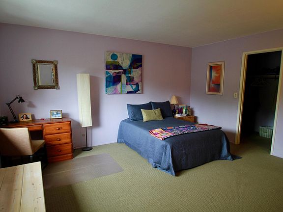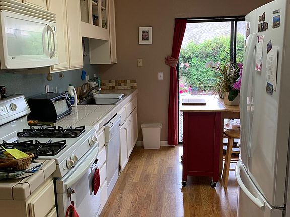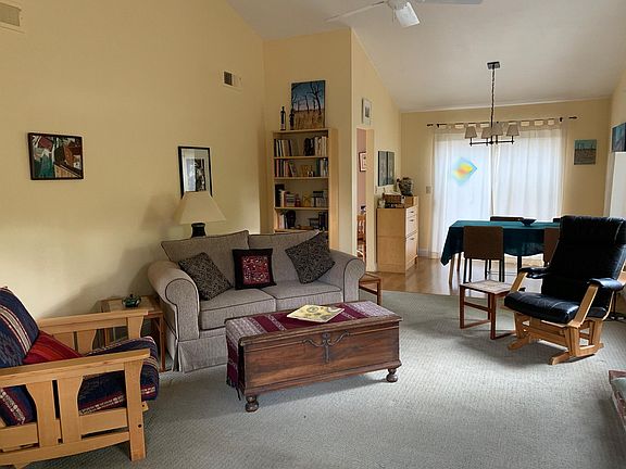 Filled with light, the living room and dining area have two sliding glass doors and three more windows with high ceilings as the bedrooms are over the garage and kitchen, which has a third sliding glass door to the back patio and secluded spacious yard. Quiet and private. Upstairs are two masters, one is very large, both have walk in closets and a bath. Full two car garage plus workshop bench and lots of shelving.