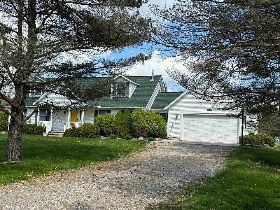 Beautiful cape cod situated on 10.74 acres! Featuring kitchen and dining room with hardwood flooring and first floor master suite with WIC & on-suite bathroom. Full, finished basement with wet bar and snack bar! Additional room downstairs could be used as 5th bedroom! 2 car attached garage and additional 800 sq ft garage with lean-to. Pole barn. Large deck that leads to hot tub. Newer furnace & C/A (2023). 2 grassed acres and the rest is wooded. Pond that is great for swimming! A quiet country paradise!